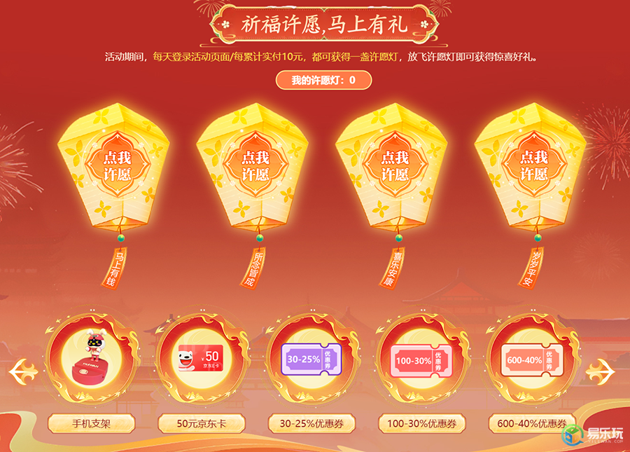 活动期间,每天登录活动页面/每累计实付10元,都可获得一盏许愿灯,放飞许愿灯即可获得惊喜好礼